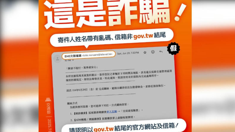 根據《TVBS新聞網》報導,詐騙手法日新月異,最近有不法分子竟然冒充政府監理機關,大量發送電子郵件進行詐騙。交通部緊急提醒,政府官方網站一定以「gov.tw」結尾,監理單位也絕對不會用電子郵件通知民眾繳交罰款。