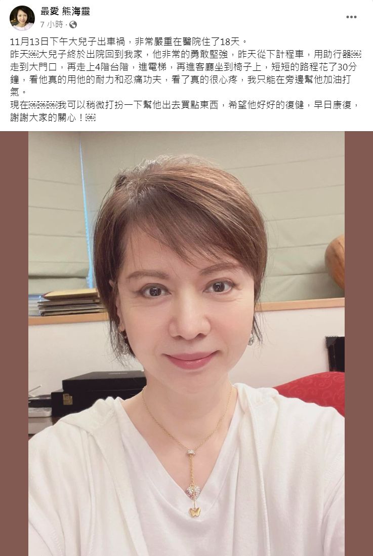 兒子發生嚴重車禍!熊海靈淚曝「躺在醫院18天」 下車走進家門「要花30分鐘」只能靠步行器