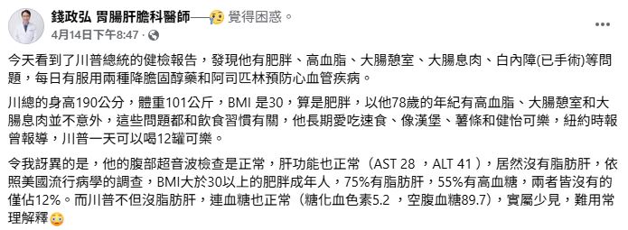 究竟是什麼原因讓川普能維持如此健康的身體狀況?醫師歸納出幾個關鍵因素:首先,他非常遵醫囑,按時服用兩種降血脂藥物控制膽固醇;其次,他持續追蹤大腸方面的健康問題;最重要的是,過去5年他成功減重9公斤,這對改善血糖和脂肪肝都有顯著幫助。