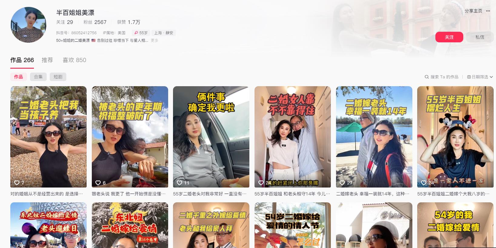 2025 年 2 月 15 日,54歲的蘇菲在抖音註冊了名為 「半百姐姐美漂」 的帳號,開始分享自己的跨國婚姻日常。儘管有不少網友斥責她 「崇洋媚外」「不愛國」,但蘇菲並不在意,對她來說,能通過短視頻認識更多朋友,記錄自己與皮特的愛情,就已經足夠滿足。她既不直播帶貨,也不接廣告,玩抖音純粹是為了排遣枯燥的生活。