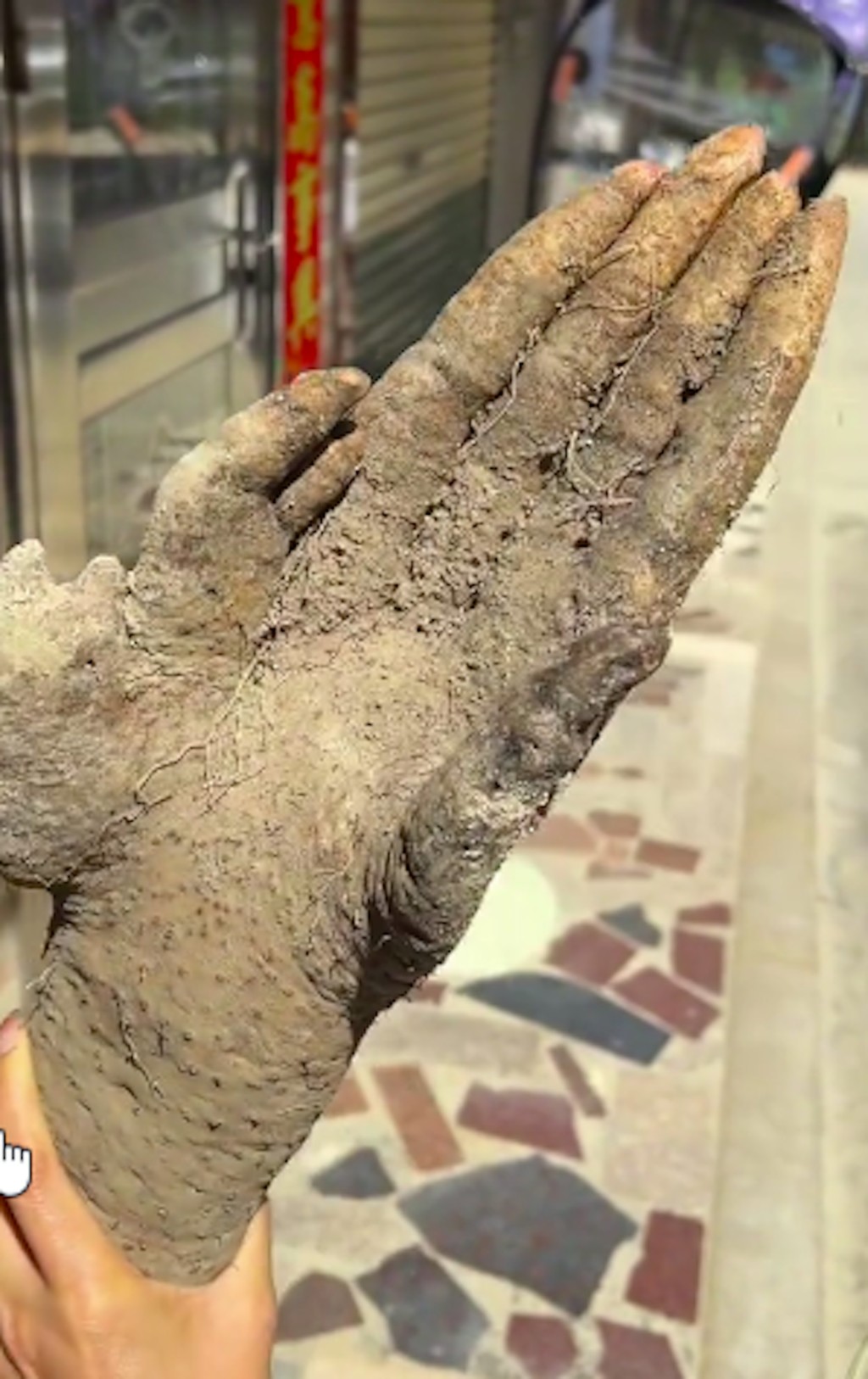 中國一位老伯伯在住家附近的菜園裡挖菜時,意外發現一條外型極為詭異的山藥,外觀竟神似人類手掌,五根手指頭一應俱全,甚至連指甲的輪廓都清晰無比,讓他當場嚇得不敢觸碰,還以為自己挖到了什麼不該碰的東西。