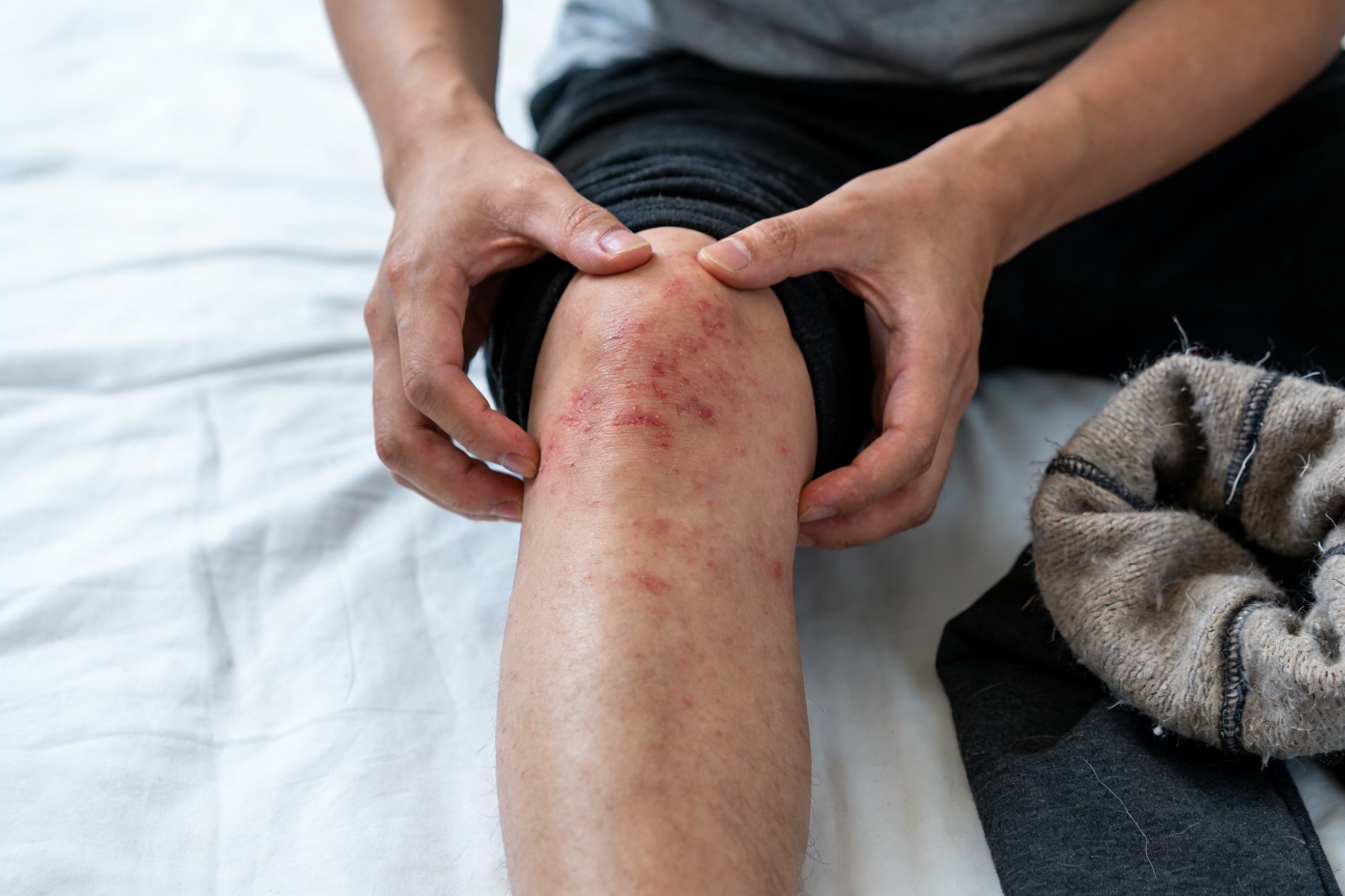 那天下午,張姐帶著兒子去超市,路上風一吹,孩子突然哭起來,抓著腿直喊 「又癢又疼」。張姐低頭一看,嚇得心裡一緊 —— 兒子腿上的紅點已經變成了一片片紅斑,有的地方還起了小水皰,抓得破了皮,滲著淡黃色的液體。更讓她崩潰的是,自己穿了兩天的加絨褲,脫下來時,大腿內側也紅了一大片,癢得鑽心,抓得皮膚發燙,甚至隱隱發疼。