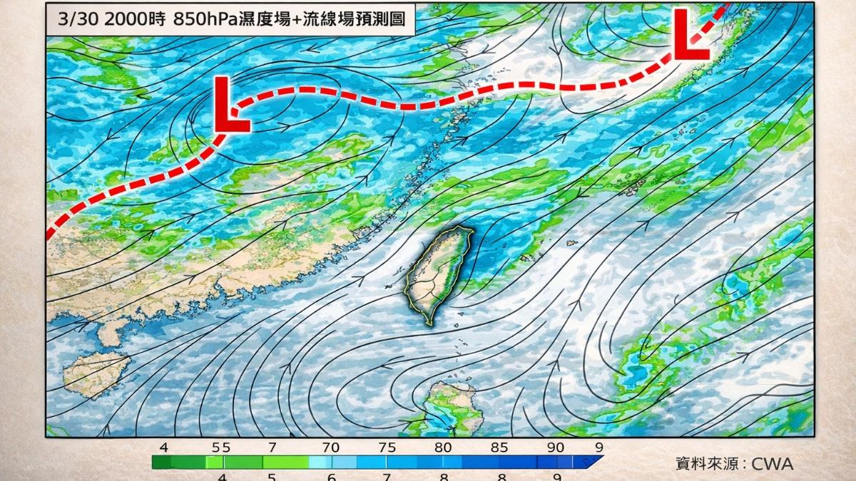 「最強春雨鋒面,來了」,林得恩根據中央氣象署最新10日預報資料說明,下週二(31日)將有一道新的春雨鋒面南下,伴隨東北季風增強影響全台天氣。這波鋒面與先前相比,不僅結構更加完整,位置也明顯南移,有機會深入台灣北部陸地,加上環境水氣含量較為豐沛,可能伴隨強風、雷電等劇烈天氣現象,民眾務必提高警覺。