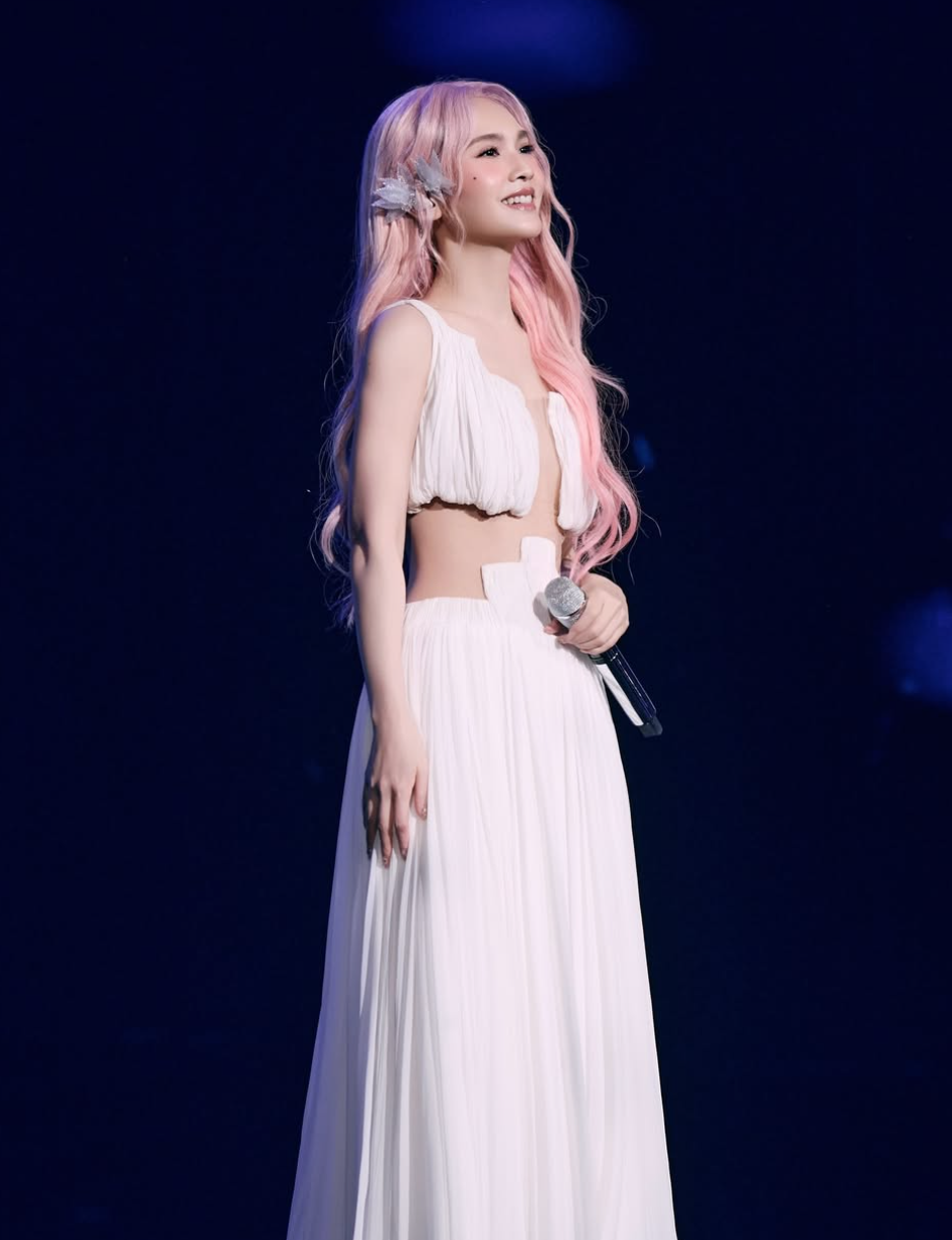 當天晚上,楊丞琳身穿一襲夢幻般的淺紫色平口露肩禮服現身舞台,大方秀出白皙的肩頸線條。這套禮服設計相當別出心裁,胸前有精緻的立體抓皺裝飾,澎澎的傘狀裙襬上佈滿閃耀亮片,並以水鑽線條勾勒出獨特的網格狀視覺效果,整體舞台呈現華麗又吸睛。