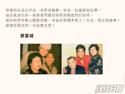 不僅如此,隔天舉行告別式時,郭富城帶著妻子方媛連兩天到現場致哀,出殯時更和家屬一同負責扶靈,用行動親自送對方最後一程,畫面曝光讓人眼眶都紅了,而郭富城也在梁桂榮的紀念特刊上留下文字,他寫下:「世伯的笑容向太陽般溫暖,永遠亦照耀著家人、女兒、朋友和後輩,謝謝你梁世伯,永遠懷念您!」滿滿感恩之情都夾雜其中!