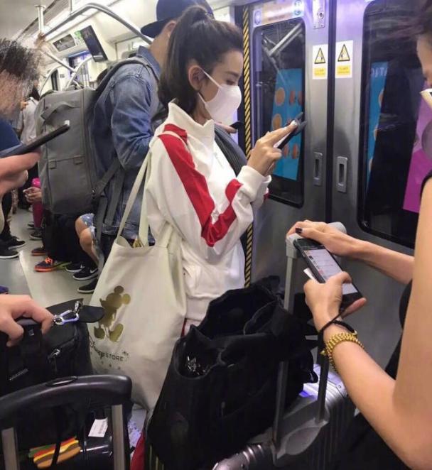 而在不久前,也有一位知名女星出現在地鐵車廂中。只見照片中的她扎了一個高馬尾,並穿著以白色為主、紅色為輔的全套休閒運動裝,背著迪士尼白色大包,戴上口罩,靜靜地滑手機。雖然全身幾乎包緊緊,但氣質與過人的美貌仍從眉宇間流露出來,被一旁的乘客捕捉,並上傳到網路上。