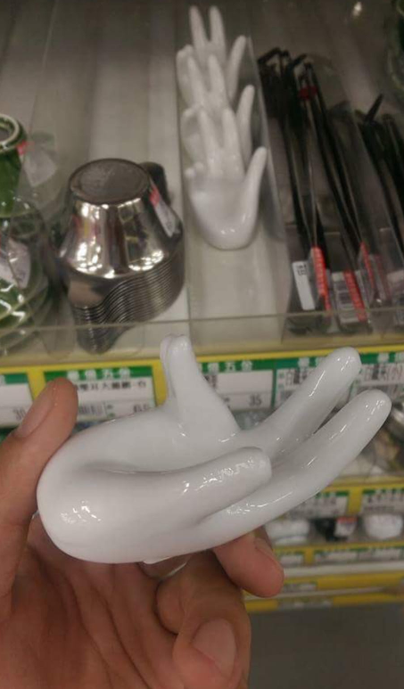 只見「這隻手」的材質是陶瓷製,尺寸約是成人半個手掌大,手掌微微打開做出類似數字8的手勢,但食指、中指並非伸直,反而有點微彎,讓人看了滿頭問號......