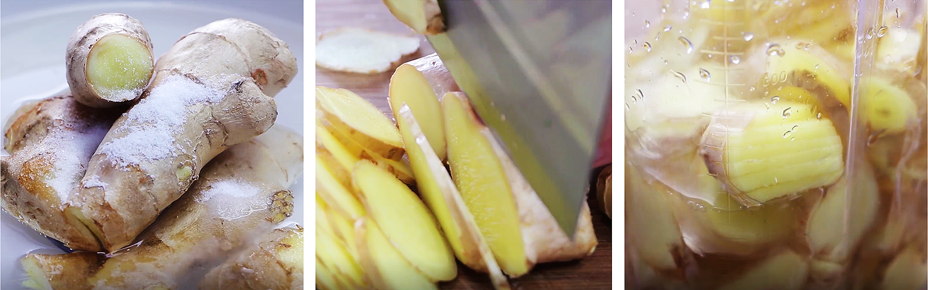 7、然後再往料理機中加入適量沒過薑片的清水,按果汁鍵把生薑打成細膩的薑汁,盡量多打一會兒。