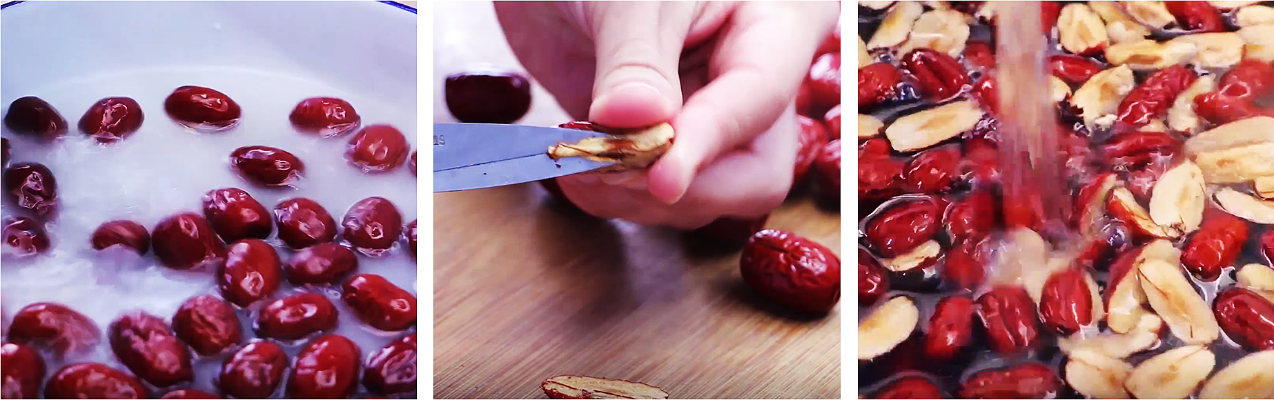 3、把清洗好的紅棗放在案板上,用剪刀把紅棗的棗核剪掉不要,再把紅棗的果肉剪成小塊備用。