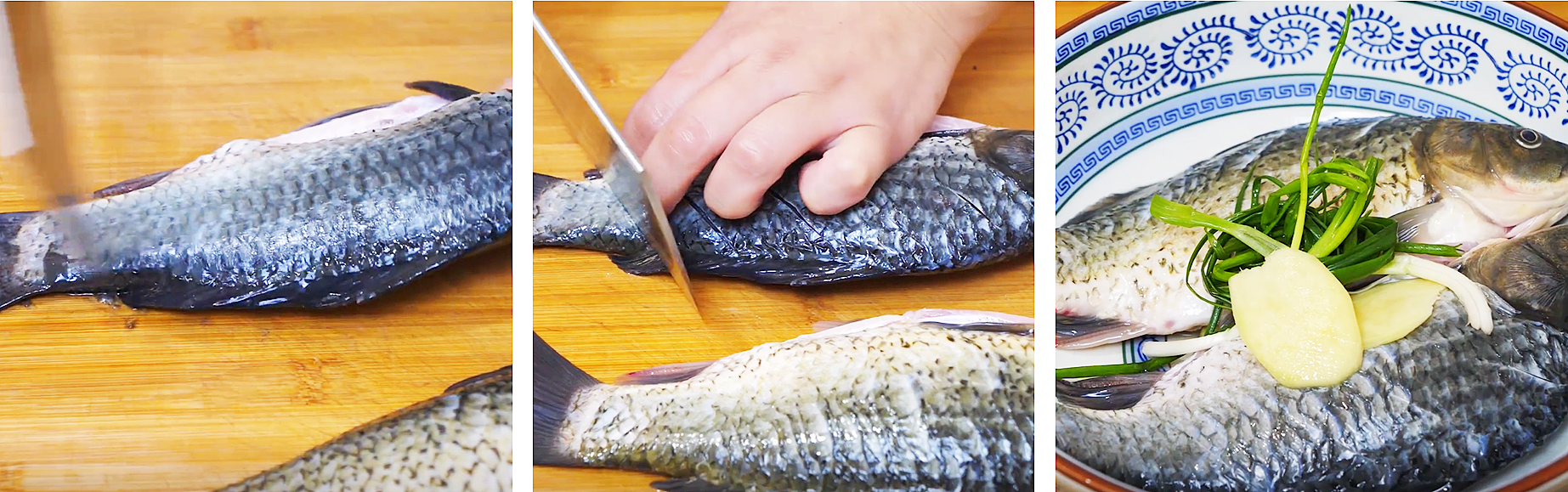 3、把處理好的鯽魚放在案板上,用刀再魚身上肉質比較厚的地方打上一字花刀,這樣方便鯽魚入味和成熟。