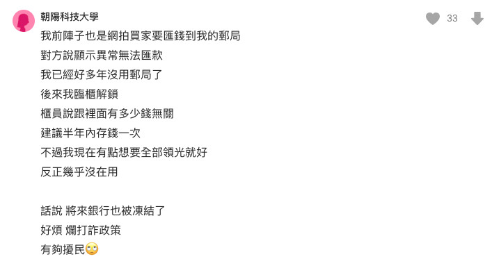 原PO心想「我有打錯帳戶嗎?」隨即打開郵局App確認,沒想到就跳出帳戶凍結的畫面,「只不過半年左右沒用而已,帳戶怎麼就被凍結了?」。原PO趕緊跟買家解釋,「我郵局被凍了!但我真的不是詐騙也不是車手」,還好對方願意相信他,最後改用其他銀行帳戶順利完成交易。