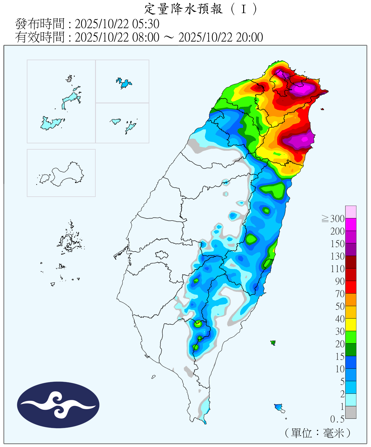 氣象專家預測,到了周六、周日,台灣周邊的水氣含量將明顯下降,但台北、新北及宜蘭等迎風面山區仍可能出現大雨。未來一周受到北方冷高壓影響,各地氣溫偏低,北部及東北部溫度在21至25度之間,中南部則介於22至31度,建議民眾適時添加衣物。