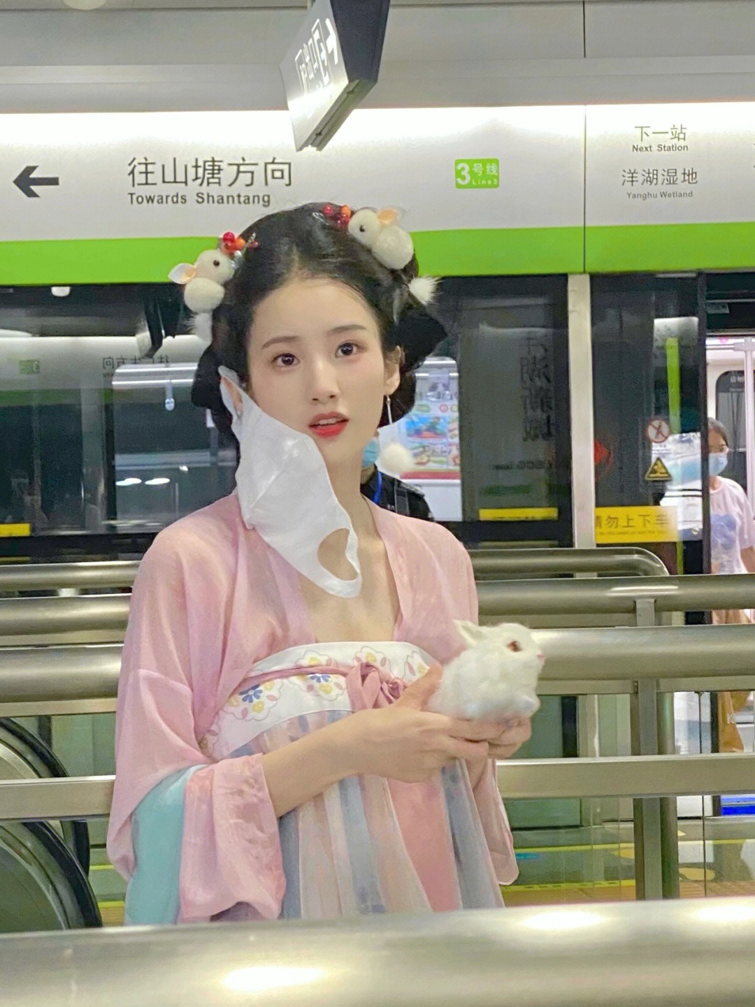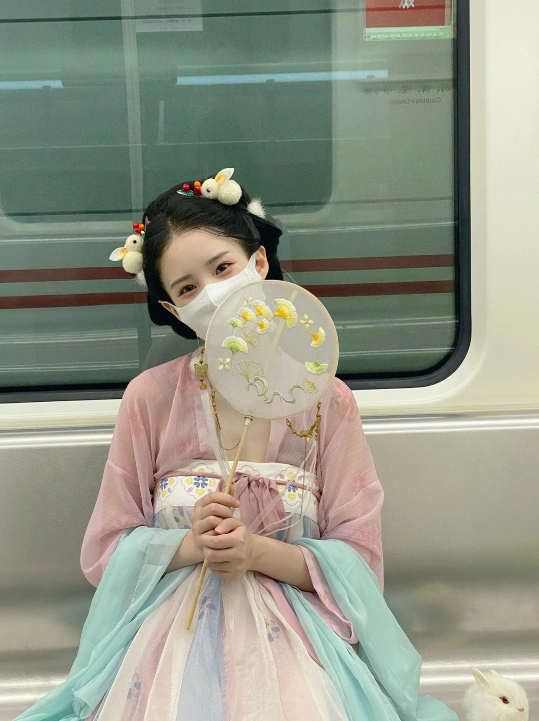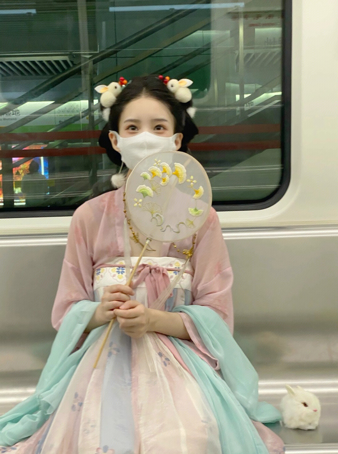 把春天穿在身上!地鐵上出現「口罩漢服女孩」粉嫩色系超萌 口罩下「甜甜笑容電翻」穿旗袍也超Q