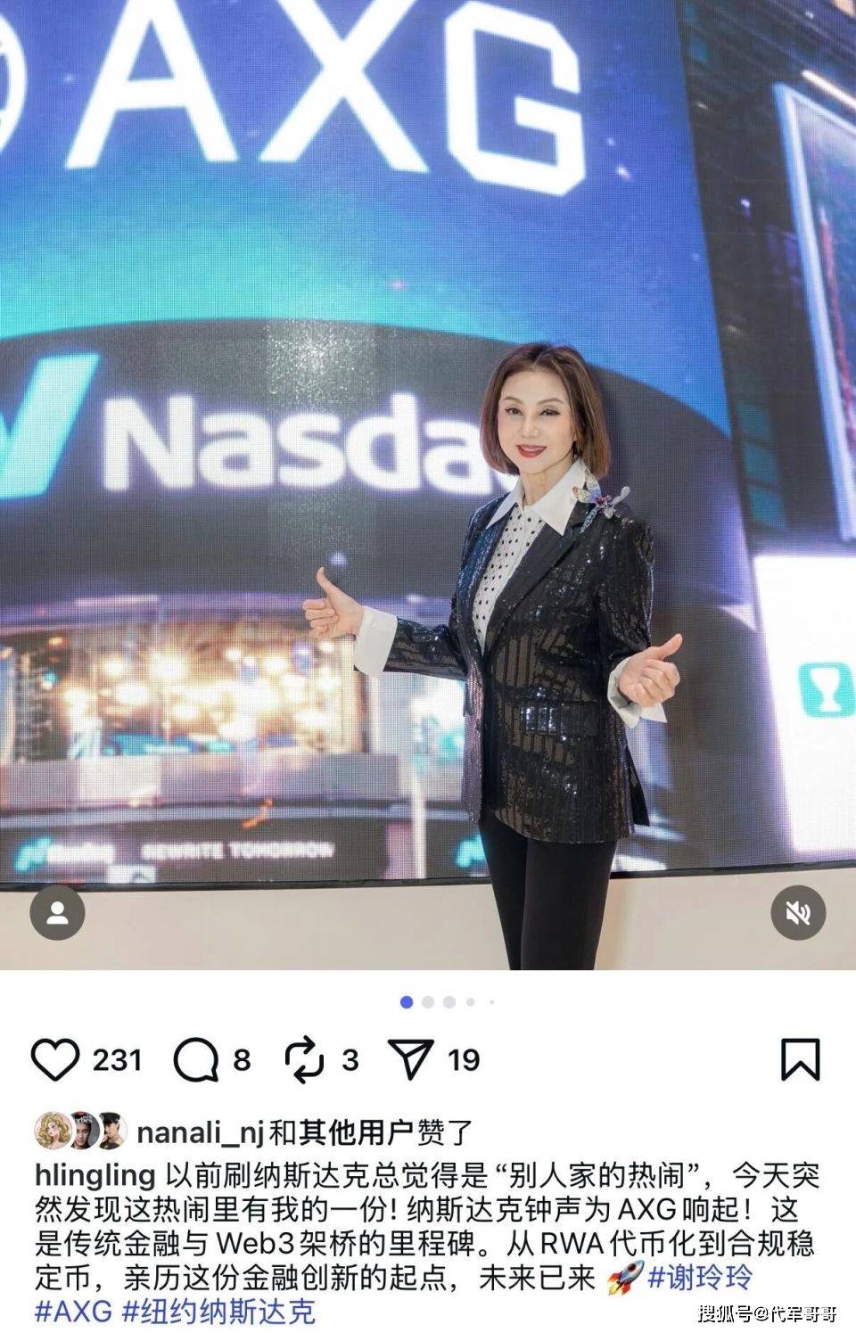 2025年10月24日,這一天對於謝玲玲來說意義非凡。她親自前往美國紐約時代廣場的納斯達克交易所,參加 AXG 的上市敲鐘儀式。當她踏入納斯達克交易所的那一刻,一種強烈的自豪感湧上心頭。她看到交易所內人來人往,熱鬧非凡,大螢幕上閃爍著各種股票的交易數據,這裡是全球金融市場的核心地帶,而她即將在這裡見證自己投資的公司開啟新的篇章 。