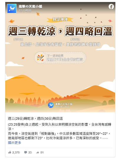 氣象專家吳德榮在「氣象應用推廣基金會」專欄中分析,今日受到東北季風的影響,迎風面的水氣將逐步減少,降雨情況趨於緩和。北海岸以及宜蘭地區會出現局部性降雨,大台北東側跟花蓮偶爾也有短暫雨勢發生的可能。北台灣白天溫度會略為回升但仍然偏涼,中南部則是白天偏熱、早晚較涼的型態。