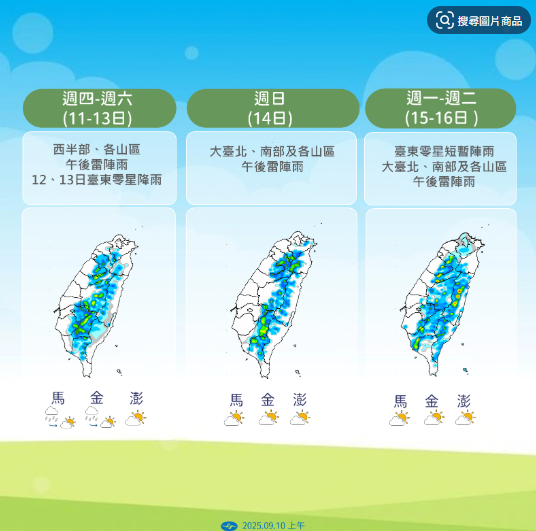 本週台灣仍處於太平洋高壓的影響範圍,各地維持高溫炎熱的天氣型態,午後西半部及東半部山區可能出現零星雷陣雨。今日各地氣溫仍相當悶熱,大台北及南高屏地區局部地區恐飆破36度高溫,戶外活動請特別注意防曬及補充水分。