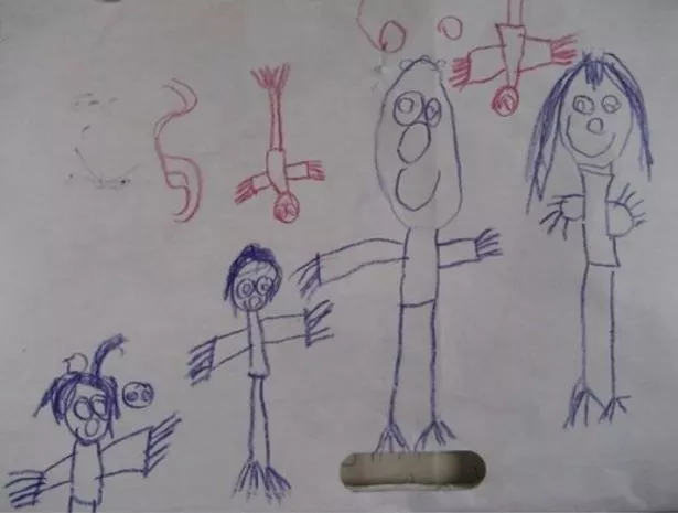 只見孩子在紙上以藍筆畫出了兩大兩小,看起來是爸爸媽媽和哥哥妹妹,正是家中現有的成員,不過圖畫的上方卻還有兩個用紅筆畫的、方向顛倒的小人?芮貝卡就針對此畫表示,「結果一年後,我生下了一對雙胞胎。」也就是說,芮貝卡兒子在5歲時的塗鴉畫,原來提前預示了未來還會有一對雙胞胎加入他們家!