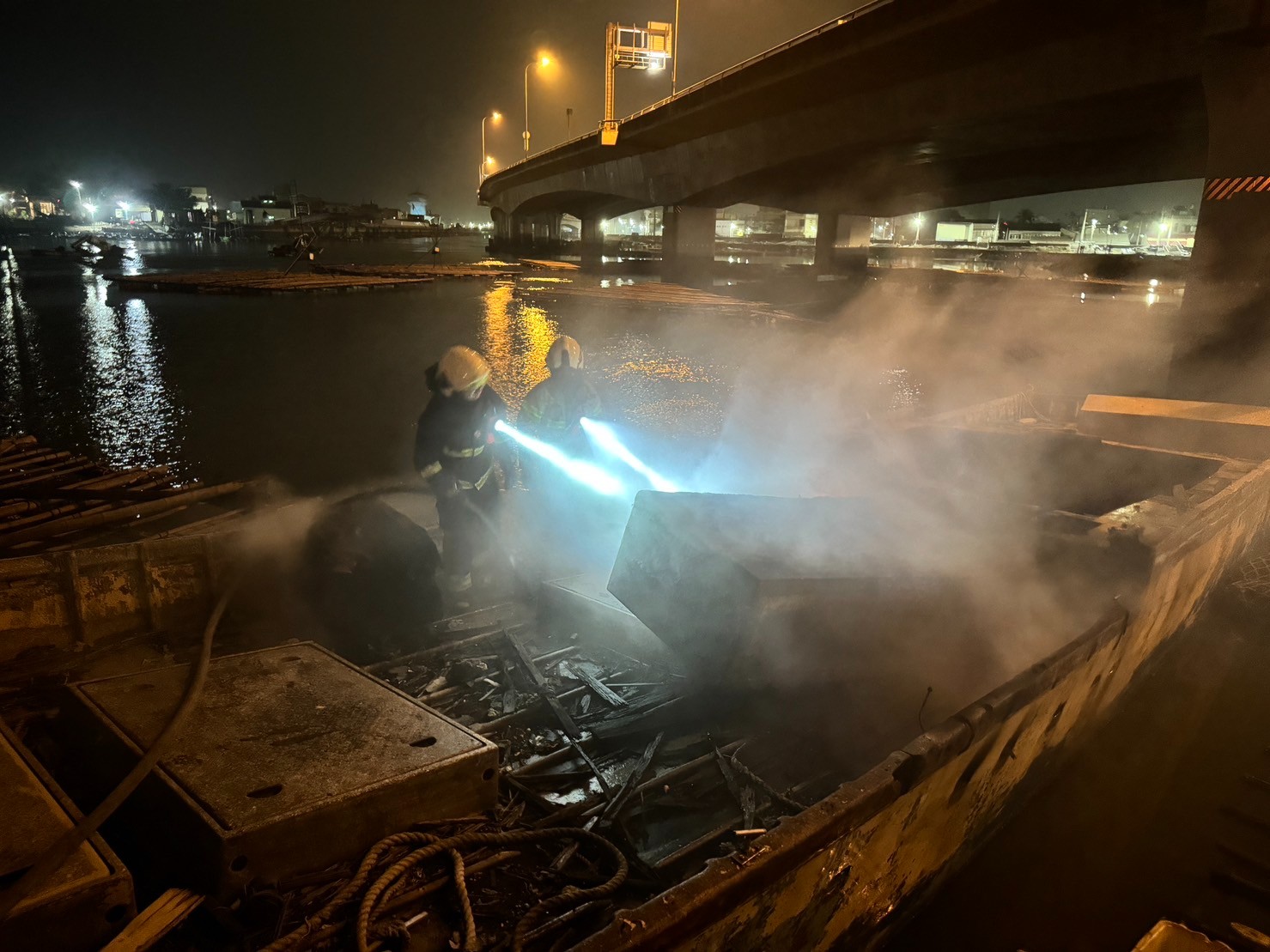 為避免漁船油料外洩造成海域污染等二次災害,海巡人員當機立斷聯繫嘉義縣環保局人員到場評估狀況,並在船隻四周佈設攔油索進行防護。此外,考量船體可能復燃影響周遭其他船隻安全,海巡也將這艘受損漁船拖離原本停靠位置。