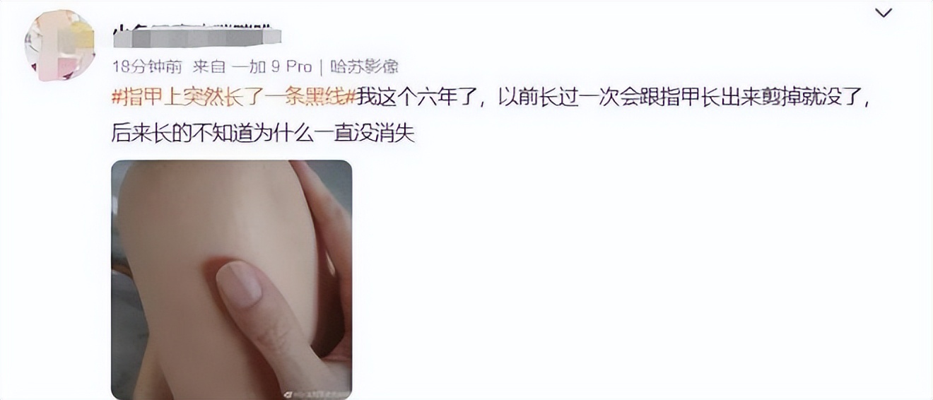 「我是不是生病了?最近半個月指甲上突然出現一條黑線,起初沒太在意,以為是自己搞了水彩筆染上去的,可是半個月過去了,發現並不是水彩筆,而是生長在指甲殼裡面的。」