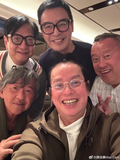 照片中的譚詠麟面色紅潤,笑容燦爛,與好友相聚時顯得格外開心,可以看到現場有鍾鎮濤、陳友及曾志偉外,更見林子祥現身,讓他大呼「最近另一次難得聚會」。