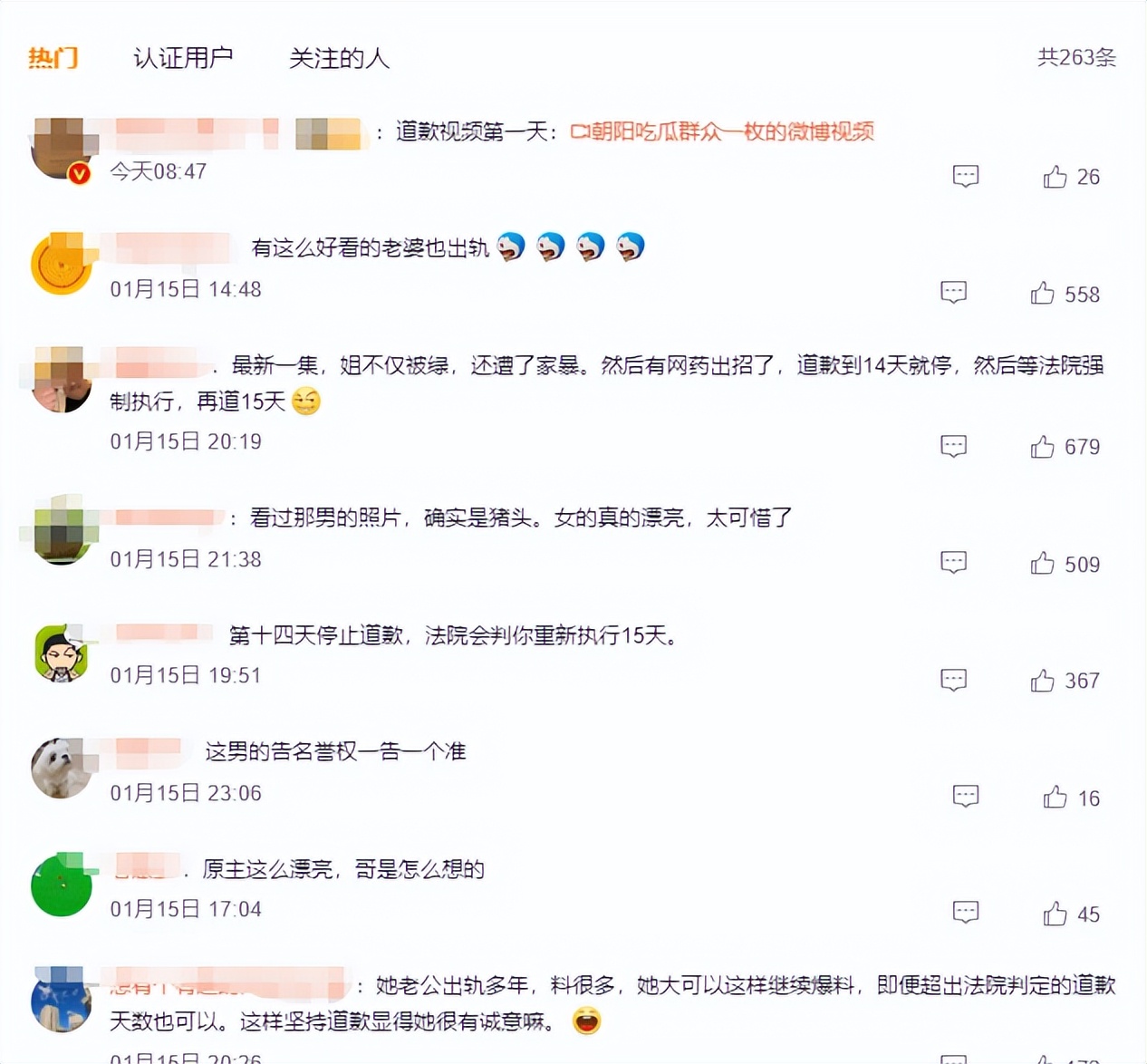 每支影片都跟連續劇更新似的,網友們也跟著起鬨,有人說早中晚各發三條才夠「有誠意」,還有人建議第十四天刪影片,逼法院強制執行延長曝光。