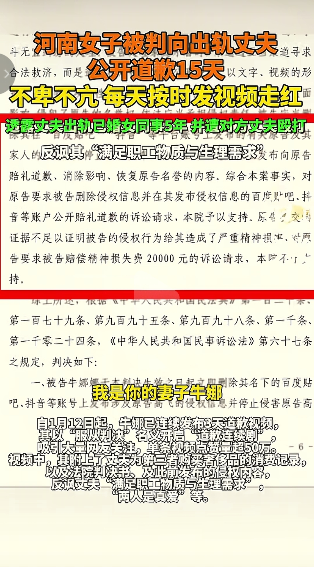 中國一個叫牛娜的河南大姐,因為曝光老公高飛出軌被法院判道歉15天,結果她把道歉變成了每天更新的連續劇,越道歉越把老公的黑歷史挖得乾乾淨淨。