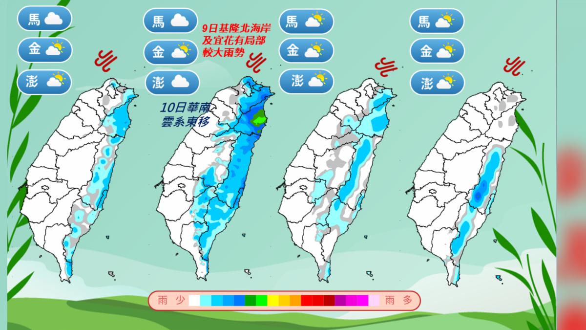 賈新興指出,今日(9日)開始受到偏強大陸冷氣團南下影響,桃園以北及宜花東地區會出現局部性短暫降雨。週二(10日)冷空氣持續發威,降雨範圍擴大至桃園以北、宜花東、南投都有局部短暫雨勢,新竹至台中一帶也可能飄起零星雨滴。到了週三(11日)午後,竹苗以南山區及宜花東山區仍有零星降雨機率。