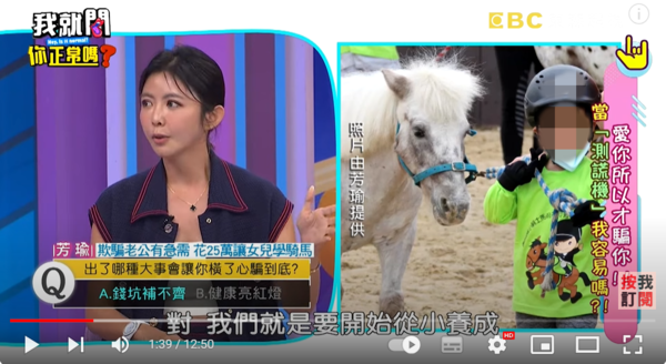 但不久後,老公向丈母娘詢問近況,沒有事先與女兒一致口徑的李母一頭霧水,老公才驚覺是李芳瑜騙了自己,氣得回家質問。原來,李芳瑜為了讓孩子擁有「貴族氣質」,決定上100堂的馬術課,但馬術課相當昂貴,讓她不得不仔細盤算如何進行,「一堂課40分鐘是3500,但如果一次儲值50萬就可以擁有兩百堂課,算下來一堂是2500,一堂可以省1000」,一頭熱之下就決定砸錢在這之上,扯謊避開老公耳目。