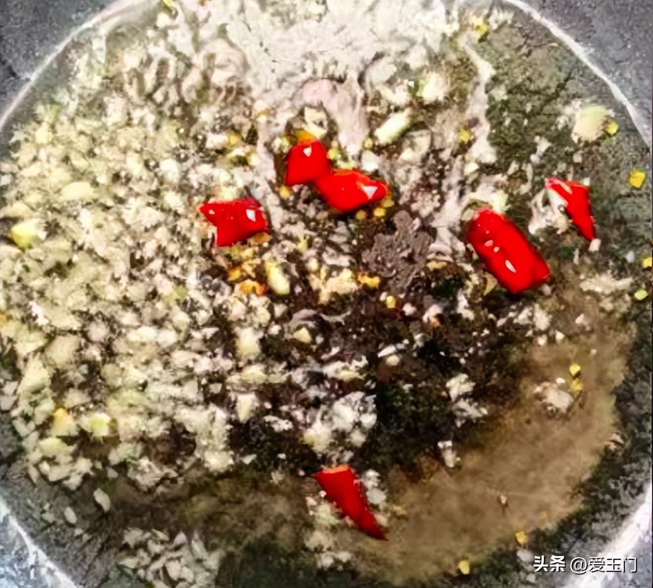 2、熱鍋涼油,下入蒜末辣椒一起煸炒出香味來。