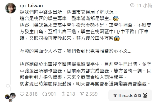 桃園客運副總立即趕赴醫院探視受傷學生,目前學生已順利出院。雙方都已完成警方筆錄,且各執一詞打算提出傷害告訴。桃園客運已暫停該名司機的勤務,並召開獎懲委員會議討論處置。網友看到這則新聞都紛紛表示:「這種司機根本不適合開車!」、「為了投幣打成這樣也太誇張!」、「成年人怎能對學生下這麼重的手?」、「希望嚴懲失控司機!」、「公司該好好審核司機的情緒管理能力。」但也有人認為:「學生應該要更沉住氣吧?」、「所以是怎樣,少投錢還有理喔?」