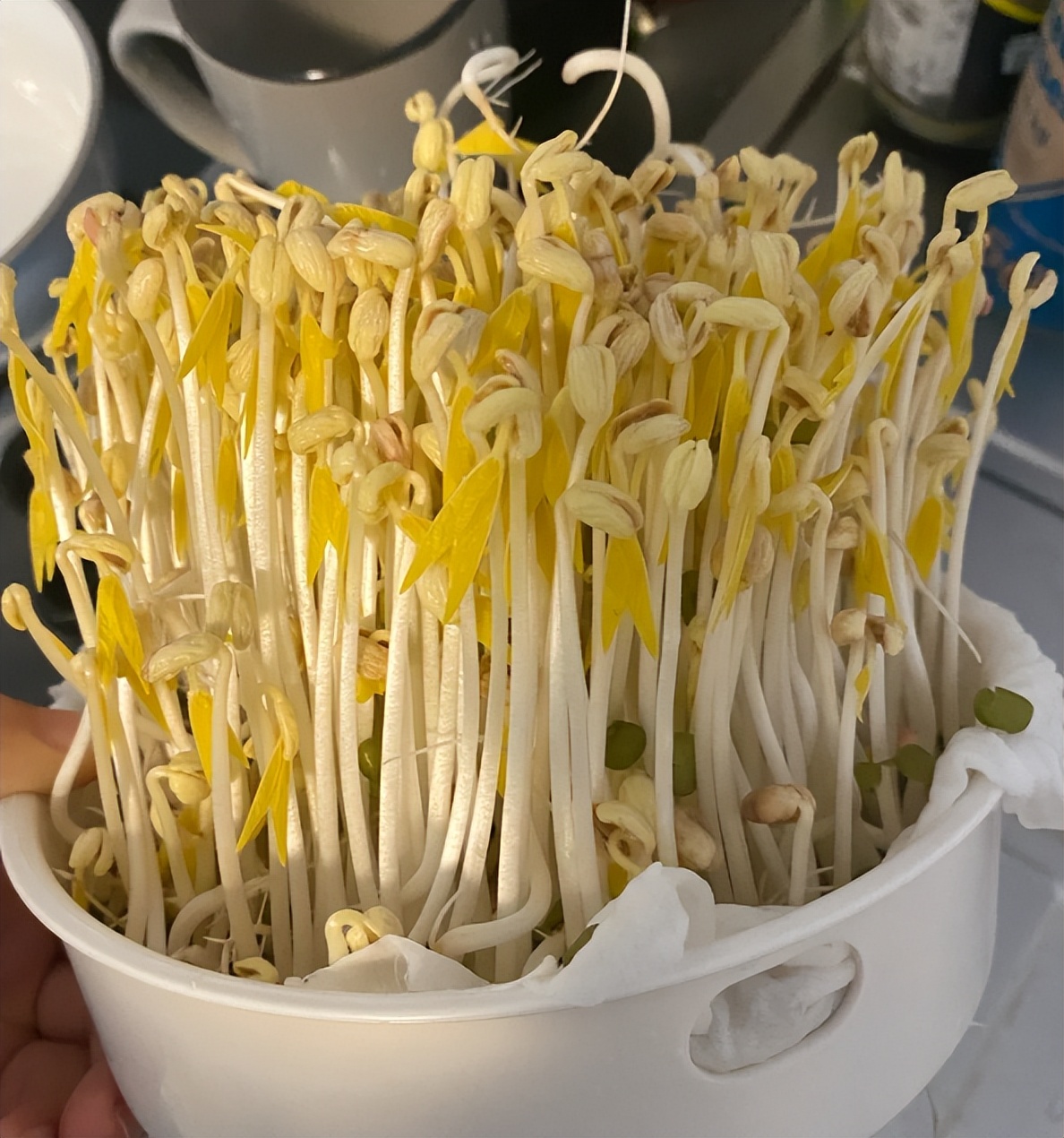 自然生長出來的豆芽,都是有根鬚的,而且顏色是微微泛黃的,根本不是純白的。