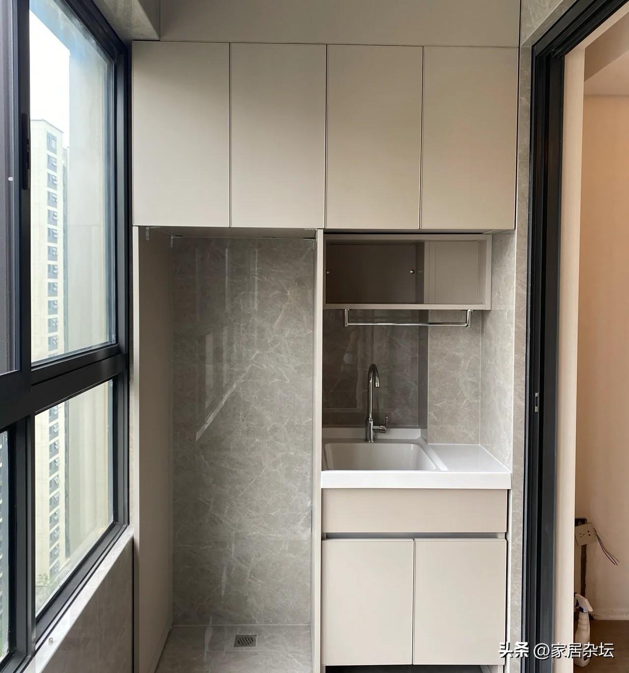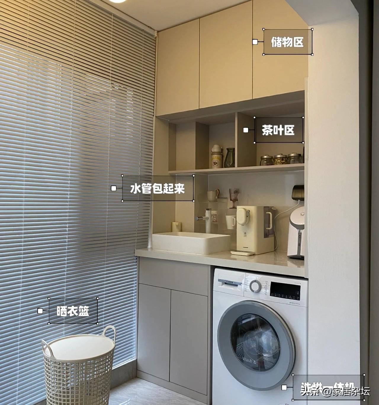 ①、陽台洗衣機的上面,要預留一個大的空間。這個空間是用來收納我們穿過的衣服,也就是準備洗的衣服可以塞在裡面。